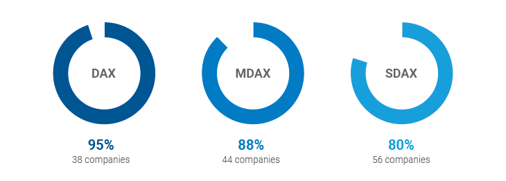 With a total of 38 (out of 40) DAX, 44 (out of 50) MDAX and 56 (out of 70) SDAX companies, around 90% of the companies comply with the requirements of the GCGC. While companies with a foreign legal form do not fall under these requirements and therefore refrain from publication, the other companies without a qualification matrix give a variety of reasons for their deviation from the GCGC. These range from stating that the matrix has not yet been drawn up and the required competences of the supervisory board are sufficiently taken into account. Some comment that the bureaucratic requirements leads to unnecessary additional work and that the qualification matrices do not represent any additional value.